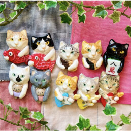 大好きなねこちゃんを石塑粘土で1つ1つ手作りしマグネットやブローチに仕上げています。お気に入りの子を見つけたらぜひかわいがってあげてください。店頭では工房長コジロウ(の像)が熊手を片手にお待ちしております☆